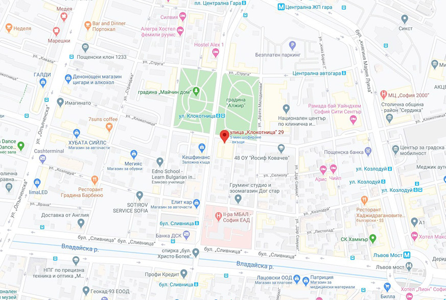 Местоположение централен офис Родинаград София, ул. Ген. Й. Гурко 74, офис. 1 Местоположение на учебната база на РодинаАдрес: град София, ул. Клокотница 29, ет. 1 Достъпът до учебната база, в която се провеждат курсовете, е възможен както от всяка точка на София, така и от цялата страна с всякакъв вид транспорт: